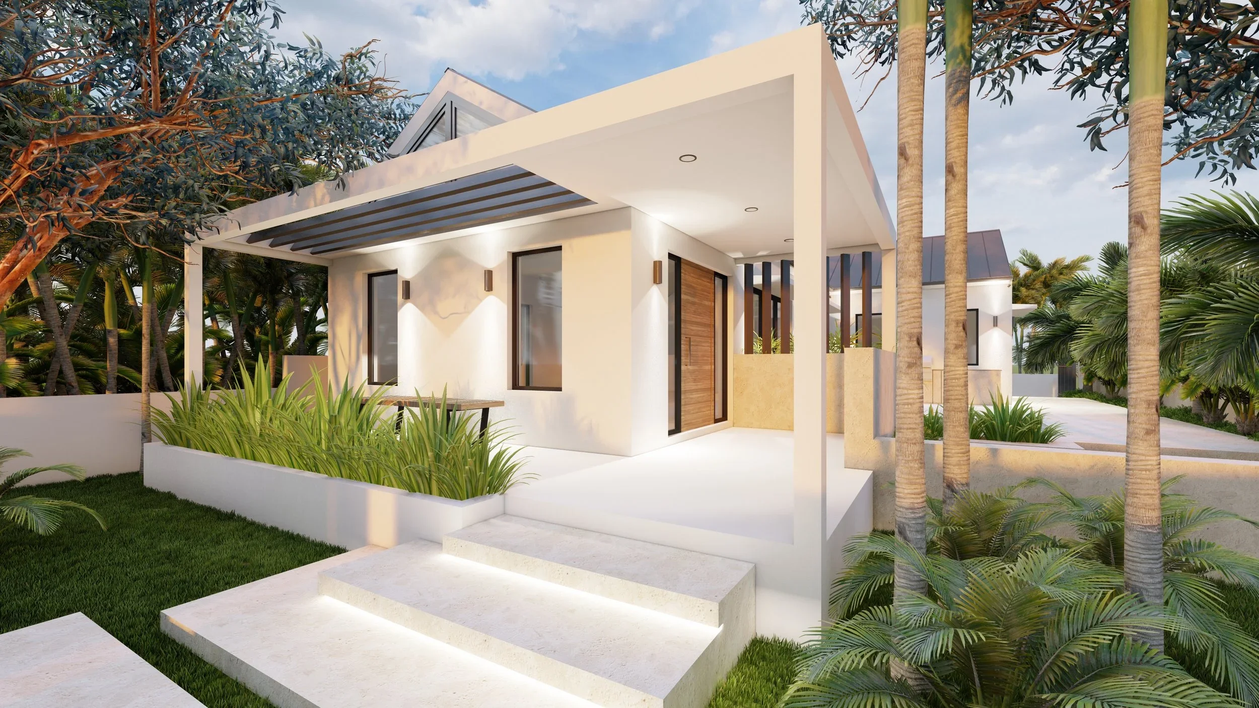 In a challenging corner lot, ANDstudio had to optimize the distribution of the rooms to be able to accommodate 3 Bedrooms, 3 Bathrooms, a Living Room, Kitchen, Dining Room, and a Laundry Room, all under 1,800 Sq. Ft. of AC. The Exterior Entertaining Area includes a Swimming Pool, an Outdoor BBQ and Dining Area, an Outdoor Shower and Parking for 2 vehicles.